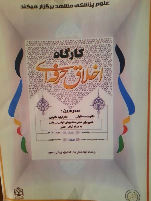 انجمن علمی دانشجویی گروه مددکاری اجتماعی دانشکده پیراپزشکی مشهد،کارگاه آموزشی با عنوان «اخلاق حرفهای در مددکاری اجتماعی» را با حضور جمعی از دانشجویان این رشته و با تدریس سرکار خانم دکتر ملیحه خلوتی و سرکار خانم دکتر فریبا ماهوتی ، اعضای محترم هیأت علمی گروه، برگزار کرد.